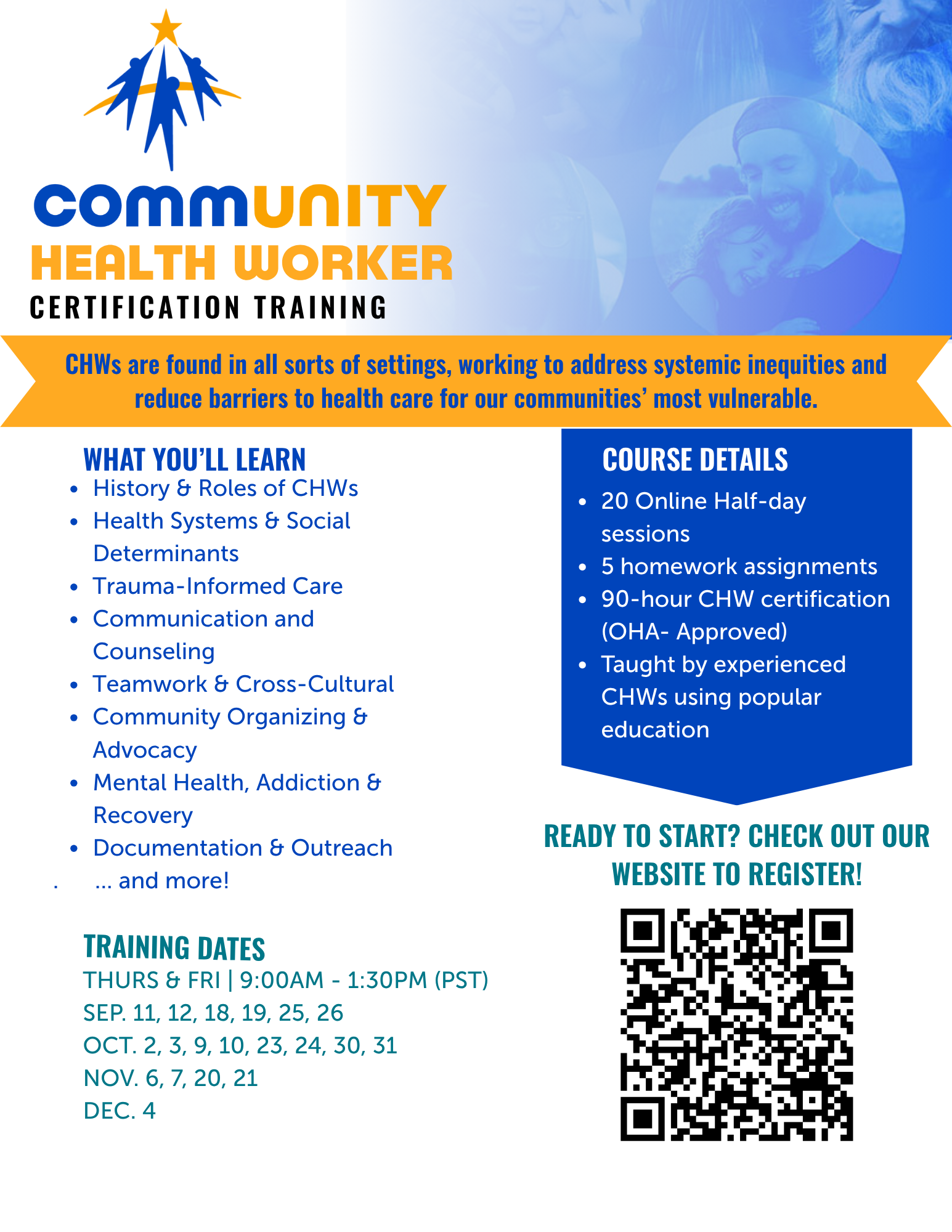 Upon completion, you’ll qualify for certification as a Community Health Worker and earn 90 Continuing Education Credits (CEUs) through the Office of Equity and Inclusion in the State of Oregon.